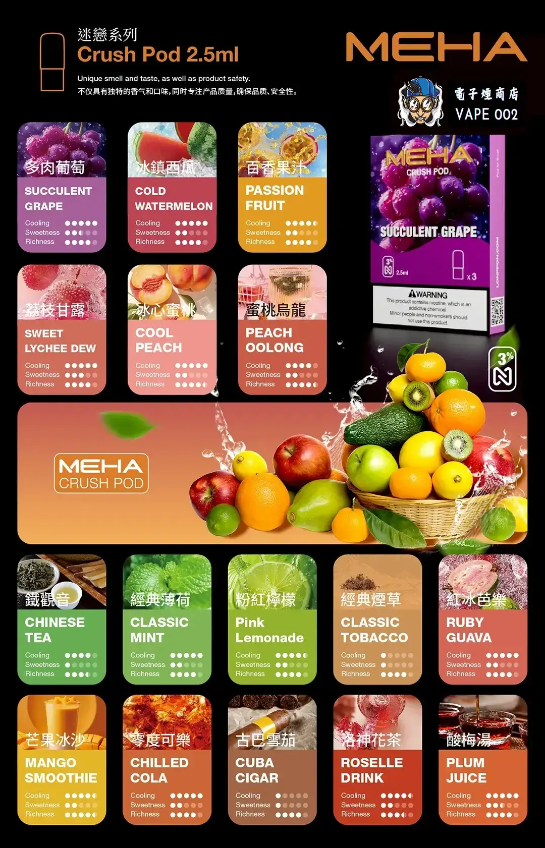 - As the e-cigarette market continues to thrive, consumers are demanding more in terms of flavor, quality, and overall experience. MEHA, known for its consistently high manufacturing standards and innovative flavors, proudly presents its latest creation — the Crush Obsession Series 5th Generation Vape Pods (2.5ML, pack of 3). Designed specifically for e-cigarette enthusiasts who crave a variety of flavors and long-lasting performance.